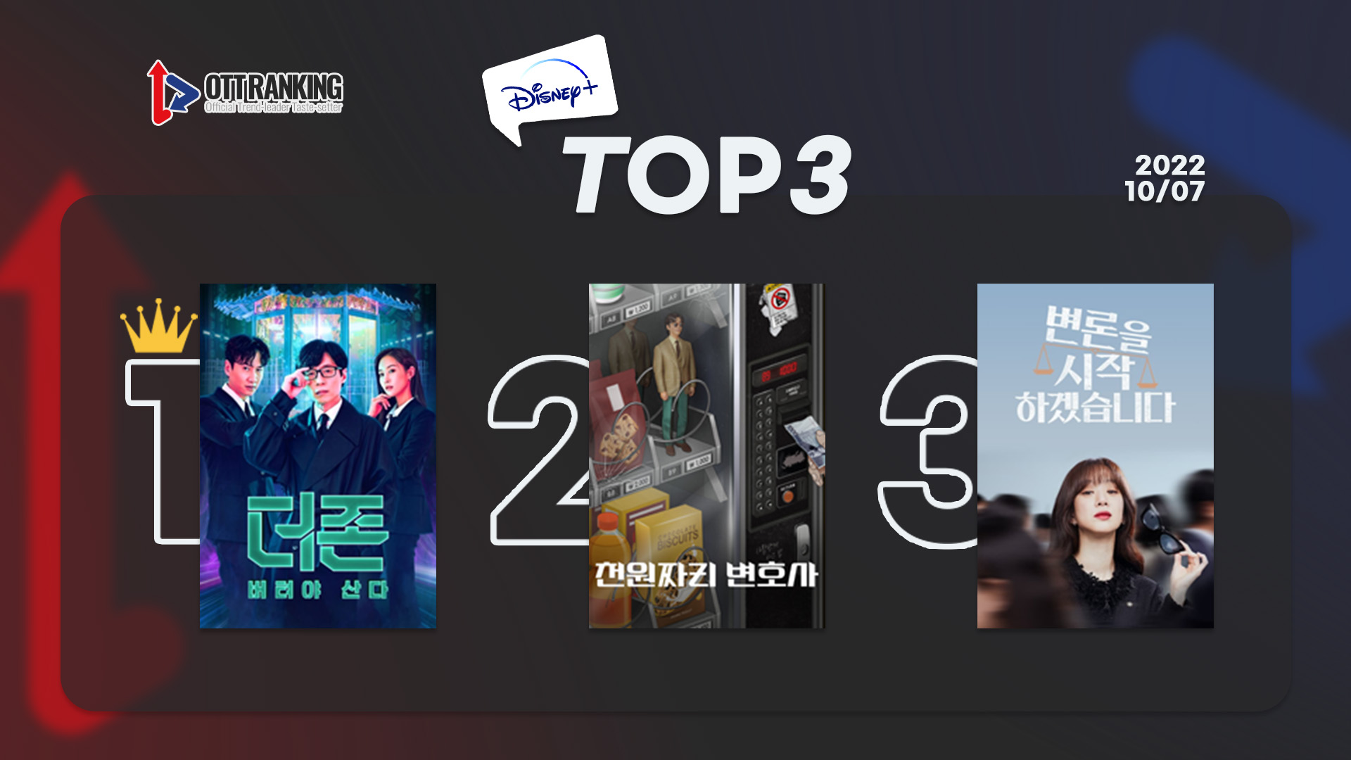 2위에는 SBS <천원짜리 변호사 One Dollar Lawyer>가 이름을 올렸다. 금토극 TV시청률 1위에 이어 OTT 통합랭킹, 데일리 랭킹 등 각종 차트에서 최상위권에 등극하며 독보적 클래스를 입증했다. 정려원, 이규형, 정진영이 열연을 펼친 오리지널 시리즈 <변론을 시작하겠습니다 May It Please the Court>가 3위에 안착했다.