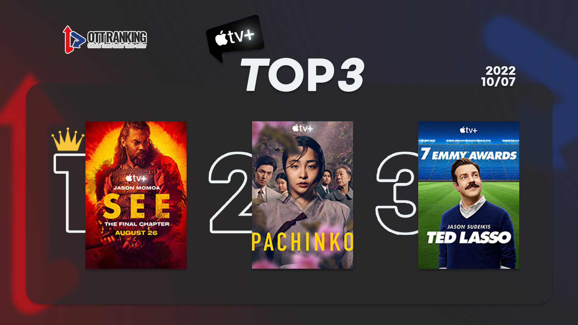 애플TV+(APPLE TV)의 TOP3는 지난주와 같다. <SEE 어둠의 나날 그 여정의 끝>, <파친코 Pachinko>, <테드래소 Ted Lasso>가 최상위권을 유지했다. 한국 오리지널 작품 중에서는 <닥터 브레인 DR. Brain>이 12위에 랭크됐다. 배우 이선균은 <닥터 브레인>(2021)으로 제50회 국제 에미상 남우주연상 후보에 오르며 작품에 대한 궁금증을 고조시켰다.