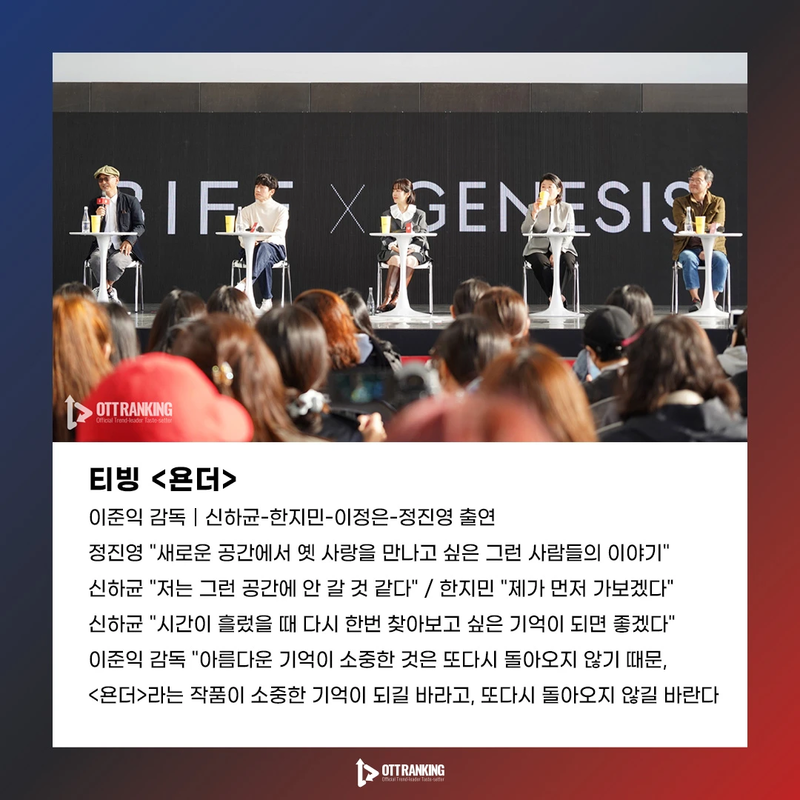 [27th 부산국제영화제] '커넥트-약한영웅-욘더', 오픈토크 말말말 입력 2022-10-07 16:30 수정 2025-04-09 18:23 제27회 부산국제영화제 7일 오픈토크 '커넥트'-'약한영웅 class1'-'욘더' 기대감 높이는 배우·감독들의 말말말 Previous "안 볼 이유 없을 것" 김혜수, tvN·티빙 '슈룹' 향한 자신감 [� Next [27th 부산국제영화제] 디즈니+ '커넥트' 정해인 "미이케 감독 관련기사 Romance in 21st Century Grand Prince’s Wife Sparks BuzzElena NovakDrama Review 2025-11-13 19:26 [OTT 한줄평] 영화 '3일의 휴가'Jane RimOTT Online Line Review 2024-03-15 15:41 [OTT 한줄평] 영화 '비밀'Jane RimOTT Online Line Review 2024-03-15 15:40 [OTT 한줄평] 영화 '뜨거운 피'Jane RimOTT Online Line Review 2024-03-15 15:38 [첫방D-DAY] “지금까지 이런 코미디는 없었다”, 이병헌 감독✕류승룡✕안재홍의 ‘닭강정’ (넷플)Jane RimContents 2024-03-15 15:30 [위클리 OTT 랭킹] 3월 2주차 디즈니·쿠팡·왓챠·애플 TOP3 – 스릴과 코믹 사이Jane RimWeekly Top3 2024-03-15 13:49 [데일리 OTT 랭킹] 3/15 웨이브·티빙·넷플 TOP10 – ‘나는 SOLO’ 과몰입의 날안현정Daily Top10 2024-03-15 10:34 [오늘의 OTT 통합 랭킹] 3월 15일 – 설레거나 스릴 있거나Jane RimOTT All Rankings 2024-03-15 10:31 [OTT 영화 랭킹] 3/14 넷플·티빙·웨이브 – 동화 같은 이야기Jane RimMovie Ranking 2024-03-14 15:18 Romance in 21st Century Grand Prince’s Wife Sparks Buzz [OTT 한줄평] 영화 '3일의 휴가' [OTT 한줄평] 영화 '비밀' [OTT 한줄평] 영화 '뜨거운 피' [첫방D-DAY] “지금까지 이런 코미디는 없었다”, 이병헌 감독✕류승룡✕안재홍의 ‘닭강정’ (넷플) [위클리 OTT 랭킹] 3월 2주차 디즈니·쿠팡·왓챠·애플 TOP3 – 스릴과 코믹 사이 [데일리 OTT 랭킹] 3/15 웨이브·티빙·넷플 TOP10 – ‘나는 SOLO’ 과몰입의 날 [오늘의 OTT 통합 랭킹] 3월 15일 – 설레거나 스릴 있거나 [OTT 영화 랭킹] 3/14 넷플·티빙·웨이브 – 동화 같은 이야기 [데일리 OTT 랭킹] 3/14 넷플·티빙·웨이브 TOP10 – 사탕보다 달콤한 [오늘의 OTT 통합 랭킹] 3월 14일 – ‘눈물의 여왕’, 흥행의 제왕! [매거진] 풋풋한 사랑으로 가득 채운 화이트데이 OTT 추천작