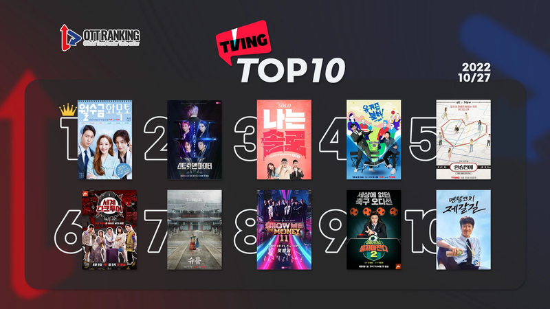 논란의 경연 프로그램 Mnet <스트릿 맨 파이터>가 2위, 연애 예능의 정석 ENA PLAY, SBS Plus <나는 솔로>가 3위로 탄탄한 마니아층을 입증했다. 마지막 선택을 앞둔 티빙 오리지널 예능 <환승연애2>가 5위, tvN <슈룹>이 7위에 머물렀다.