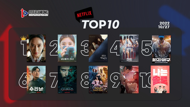 '국민 첫사랑'으로 떠오른 넷플릭스 영화 <20세기 소녀>가 2위에 올랐고, tvN <작은 아씨들>가 종영 후에도 여전한 인기로 3위를 차지했다. 글로벌 흥행을 일으킨 오리지널 시리즈 <수리남>은 6위다.