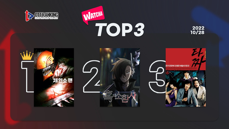 왓챠(WATCHA)는 이용자들의 취향이 분명하게 드러났다. 애니메이션 <체인소 맨 Chainsaw Man>과 <흑의 소환사(黒の召喚士) Black Summoner>가 각각 1위와 2위를 점령했다. 영화 <타짜>가 3위에 이름을 올렸다.
