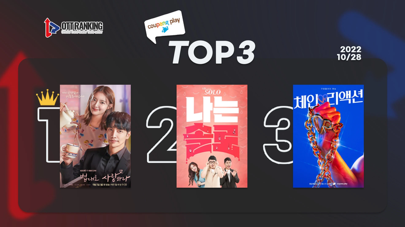 쿠팡플레이(Coupang Play)는 사랑으로 가득 찼다. 최근 종영한 KBS2 <법대로 사랑하라 The Law Cafe>가 1위를 장식했다. 다소 올드한 연출과 극본으로 독특한 매력은 없었지만, 함흥냉면 같은 슴슴한 매력에 더해진 이승기 이세영의 케미로 사랑받았다. 여러 OTT 플랫폼에서 서비스를 제공 중인 연애 프로그램 <나는 솔로 I’m SOLO>가 2위를 기록했고, 쿠팡플레이 오리지널 <체인리액션 Chain Reaction>이 3위로 인기를 입증했다.