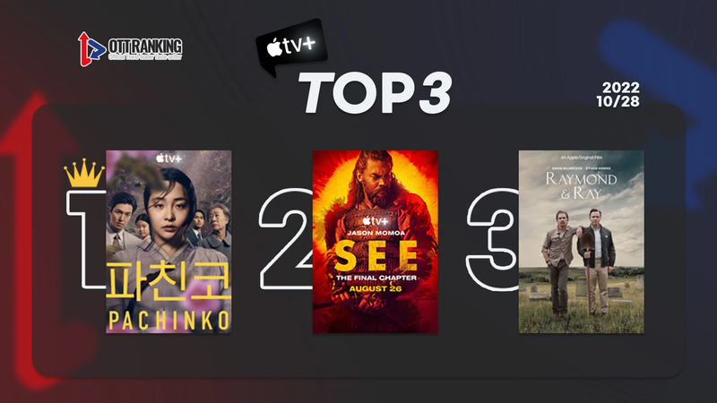 애플TV+(APPLE TV+)는 <파친코 Pachinko>가 부동의 1위를 지켰다. 시즌2 제작을 예고한 바, 장기간 왕좌를 유지할 전망이다. 이어 <SEE 어둠의 나날 그 여정의 끝>이 2위, 아버지가 돌아가시고 난 뒤, 오랜 세월 외면해온 아버지의 과거를 알아가며 성장하는 두 형제의 이야기를 담은 영화 <레이먼드&레이 Raymond&Ray>가 3위로 등장했다.