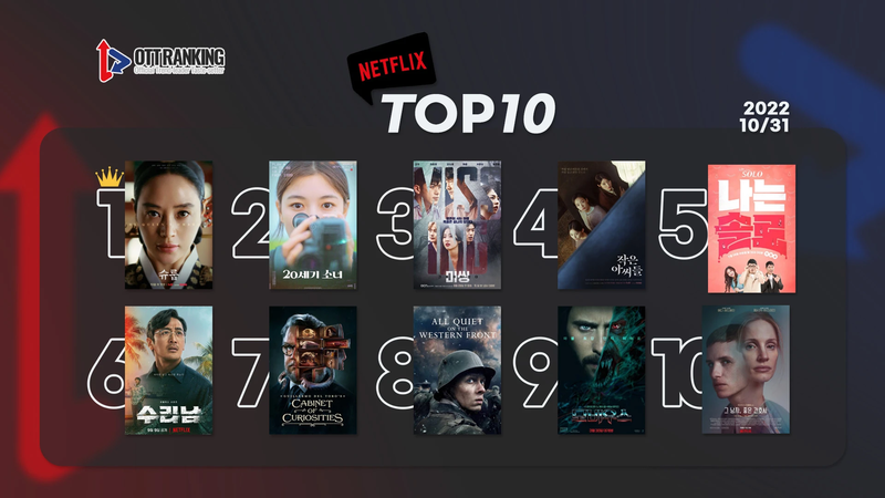 순위 변동이 적은 넷플릭스 특성상 tvN <작은 아씨들>이 4위, 오리지널 시리즈 <수리남>이 6위에 이름을 올렸다. 이어 시즌 마지막 화가 공개된 오리지널 시리즈 <기예르모 델토로의 호기심의 방>이 7위, 영화 <서부 전선 이상 없다>가 8위(영화 부문 2위)를 기록했다. 영화 <그 남자, 좋은 간호사>가 10위다.