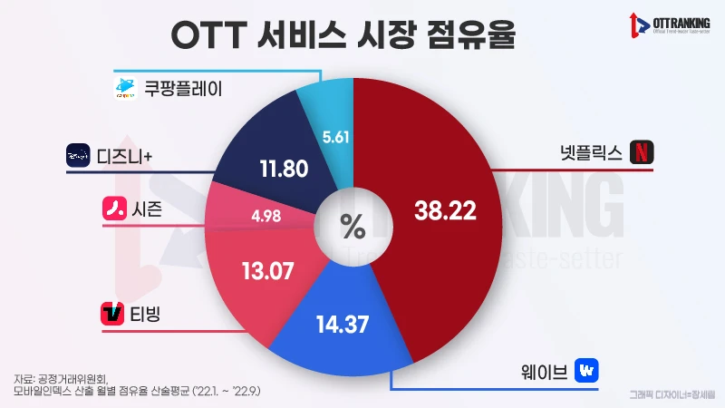 공정위는 이에 대한 근거로 모바일인덱스가 산출한 올해 1월부터 9월까지 월별 OTT 점유율을 첨부했다. 조사 대상은 넷플릭스, 웨이브, 티빙, 쿠팡플레이, 디즈니+, 시즌 등 국내에서 일정 구독료를 받고 영상 콘텐츠를 제공 중인 RMC(ready-made-contents, 일반적인 드라마·다큐멘터리 등) OTT 업체들이다.