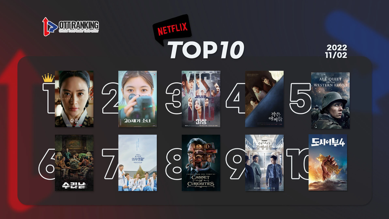 넷플릭스 영화 <20세기 소녀>가 아쉽게 2위에 머물렀다. 영화 부문 1위로 기세를 드러냈지만, 결국 종합 차트에서는 벽을 넘지 못했다. 그 가운데 영화 <서부 전선 이상 없다> 5위, 시리즈 <기예르모 델토로의 호기심의 방>이 8위에 안착했다.