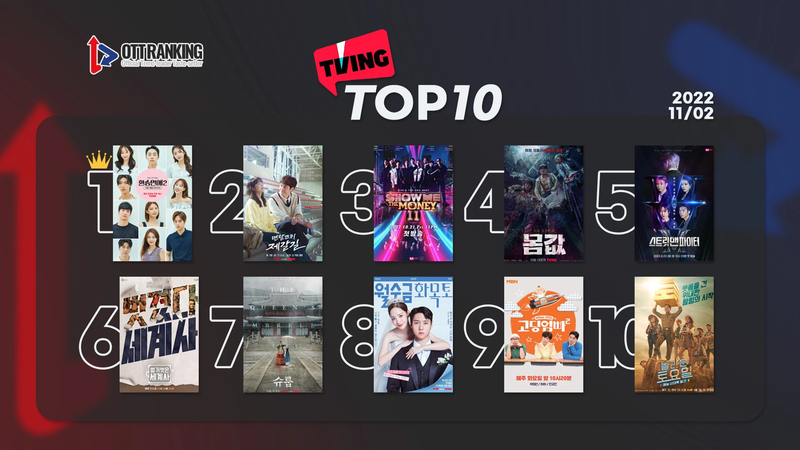 tvN 월화극 <멘탈코치 제갈길>이 우직하게 2위를 지켰고, Mnet <쇼 미더 머니11>이 3위다. 오는 4일 남은 회차 공개 예정인 티빙 오리지널 시리즈 <몸값>은 4위를 기록했고, tvN <슈룹>은 7위에 이름을 올렸다.