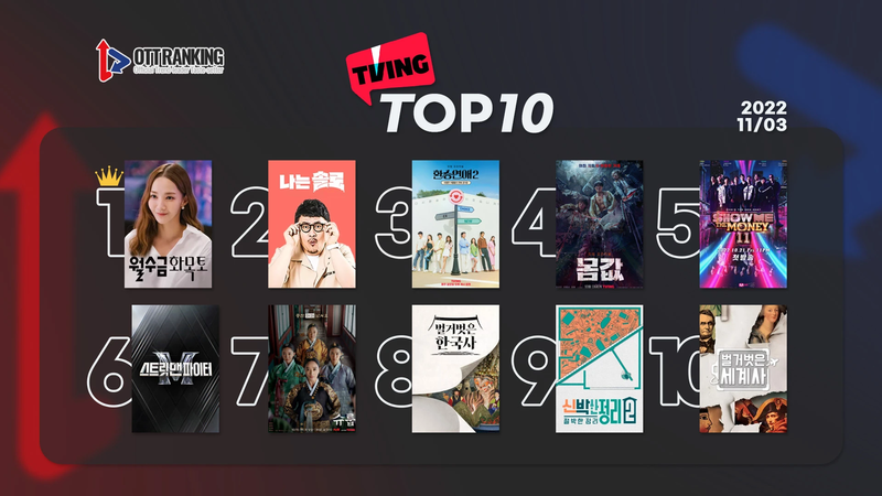 티빙(TVING)에서는 tvN 수목극 <월수금화목토>가 1위에 올랐다. 2.8% 시청률로 마니아층만 보는 드라마가 됐지만, 방영 당일 OTT에서는 높은 화제성을 자랑한다. 이어 연애 예능의 장수 프로그램 ENA PLAY, SBS Plus <나는 솔로>가 2위를 차지했고, 티빙 오리지널 <환승연애2>가 3위다.