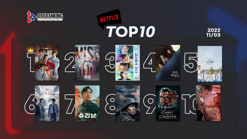 넷플릭스(Netflix) 차트에서는 신작 콘텐츠의 부재가 느껴진다. 10위권 안에 무려 여섯 작품이 옛 작품이다.현재 방영 중인 tvN <슈룹>이 1위를 지킨 가운데 지난 10월 21일 공개한 넷플릭스 영화 <20세기 소녀>가 3위로 안착하며 신작의 자존심을 세웠다. 8위와 9위는 넷플릭스 독점 공개인 <서부 전선 이상 없다>와 <기예르모 델토로의 호기심의 방>이 차지했다.