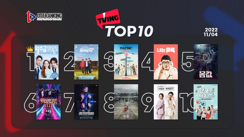 티빙 오리지널 <환승연애2>가 3위, SBS PLUS-ENA PLAY <나는 솔로>가 4위로 연애 예능의 인기를 과시했다. 통합 랭킹 1위에 빛나는 티빙 오리지널 시리즈 <몸값>은 5위에 안착했다. 더불어 tvN 토일극 <슈룹>이 8위, <나는 솔로, 그 후 사랑은 계속된다>가 9위에 이름을 올렸다.