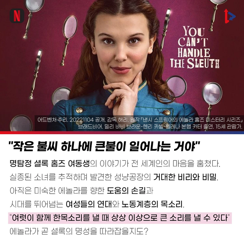 [왓츠인마이OTT] 넷플릭스 '에놀라 홈즈2' 입력 2022-11-11 17:00 수정 2025-08-01 13:47 넷플릭스 오리지널 시리즈 '에놀라 홈즈2' 셜록 홈즈 여동생 에놀라의 이야기 여성 서사에 사회적 메시지까지 Previous [OTT IN&OUT] 추리물 '에놀라 홈즈2'+‘형사록' Next 넷플릭스, 스탠드업 코미디로 라이브 스트리밍 도전 관련기사 Romance in 21st Century Grand Prince’s Wife Sparks BuzzElena NovakDrama Review 2025-11-13 19:26 [OTT 한줄평] 영화 '3일의 휴가'Jane RimOTT Online Line Review 2024-03-15 15:41 [OTT 한줄평] 영화 '비밀'Jane RimOTT Online Line Review 2024-03-15 15:40 [OTT 한줄평] 영화 '뜨거운 피'Jane RimOTT Online Line Review 2024-03-15 15:38 [첫방D-DAY] “지금까지 이런 코미디는 없었다”, 이병헌 감독✕류승룡✕안재홍의 ‘닭강정’ (넷플)Jane RimContents 2024-03-15 15:30 [위클리 OTT 랭킹] 3월 2주차 디즈니·쿠팡·왓챠·애플 TOP3 – 스릴과 코믹 사이Jane RimWeekly Top3 2024-03-15 13:49 [데일리 OTT 랭킹] 3/15 웨이브·티빙·넷플 TOP10 – ‘나는 SOLO’ 과몰입의 날안현정Daily Top10 2024-03-15 10:34 [오늘의 OTT 통합 랭킹] 3월 15일 – 설레거나 스릴 있거나Jane RimOTT All Rankings 2024-03-15 10:31 [OTT 영화 랭킹] 3/14 넷플·티빙·웨이브 – 동화 같은 이야기Jane RimMovie Ranking 2024-03-14 15:18 Romance in 21st Century Grand Prince’s Wife Sparks Buzz [OTT 한줄평] 영화 '3일의 휴가' [OTT 한줄평] 영화 '비밀' [OTT 한줄평] 영화 '뜨거운 피' [첫방D-DAY] “지금까지 이런 코미디는 없었다”, 이병헌 감독✕류승룡✕안재홍의 ‘닭강정’ (넷플) [위클리 OTT 랭킹] 3월 2주차 디즈니·쿠팡·왓챠·애플 TOP3 – 스릴과 코믹 사이 [데일리 OTT 랭킹] 3/15 웨이브·티빙·넷플 TOP10 – ‘나는 SOLO’ 과몰입의 날 [오늘의 OTT 통합 랭킹] 3월 15일 – 설레거나 스릴 있거나 [OTT 영화 랭킹] 3/14 넷플·티빙·웨이브 – 동화 같은 이야기 [데일리 OTT 랭킹] 3/14 넷플·티빙·웨이브 TOP10 – 사탕보다 달콤한 [오늘의 OTT 통합 랭킹] 3월 14일 – ‘눈물의 여왕’, 흥행의 제왕! [매거진] 풋풋한 사랑으로 가득 채운 화이트데이 OTT 추천작
