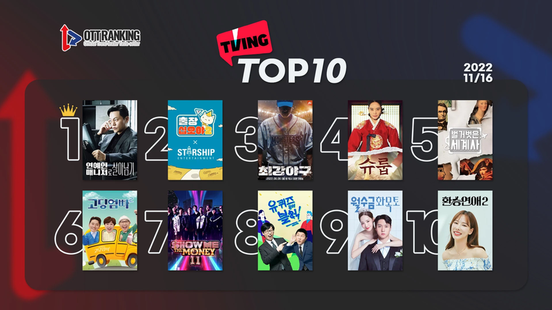 tvN <슈룹>이 4위, 전 국민 과몰입을 유발한 티빙 오리지널 연애 예능 <환승연애2>가 10위로 여전한 인기를 자랑했다.