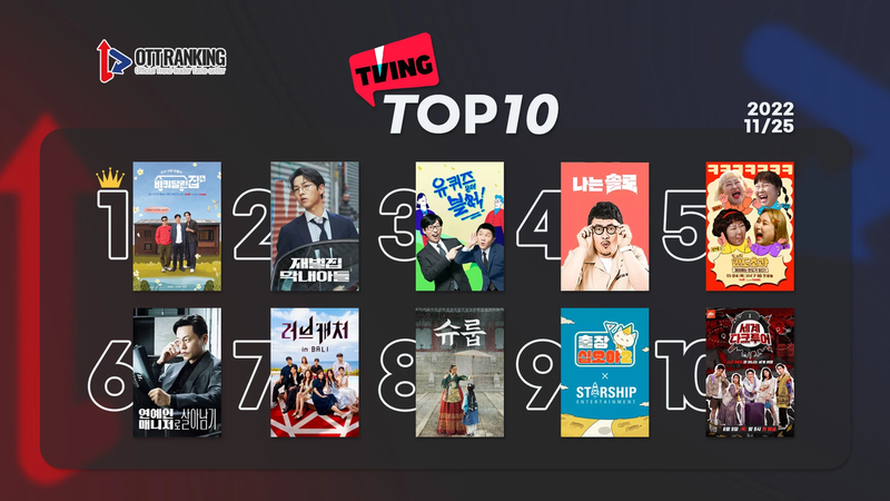 7위 오리지널 연애 예능 <러브캐처 인 발리>에 이어 tvN <슈룹>이 8위에 자리했다. 3주 동안 일요일 밤 웃음을 책임진 tvN <출장 십오야2>는 9위로 차트인했다.