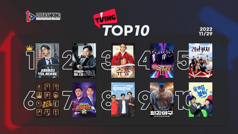 티빙에서도 송중기-이성민 주연 JTBC <재벌집 막내아들>이 이변 없이 1위를 차지했다. 15% 시청률 돌파를 앞둔 만큼 기세는 계속 이어질 것으로 보인다. 카타르 월드컵 편성과 겹치는 tvN 월화극 <연예인 매니저로 살아남기>가 시청률 하락세에도 티빙 2위를 기록했다. 방송 후 다시보기 이용자가 많은 것으로 풀이된다.