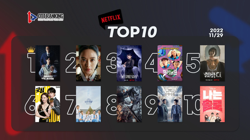 29일 [데일리 OTT 랭킹](오전 9시 기준 순위)을 살펴보면 넷플릭스(Netflix)의 차트가 다채롭다. JTBC 금토일극 <재벌집 막내아들>이 1위를 차지한 가운데 2위는 tvN 토일극 <슈룹>이다.