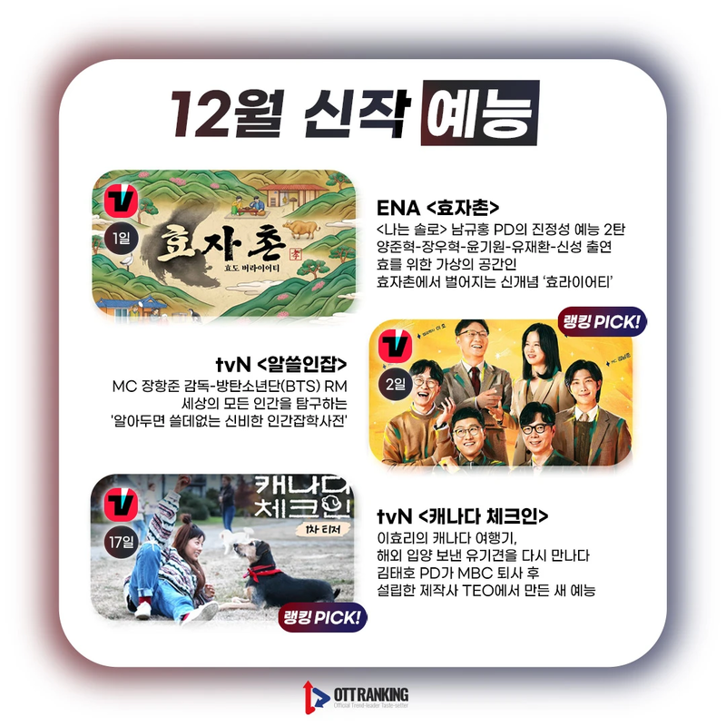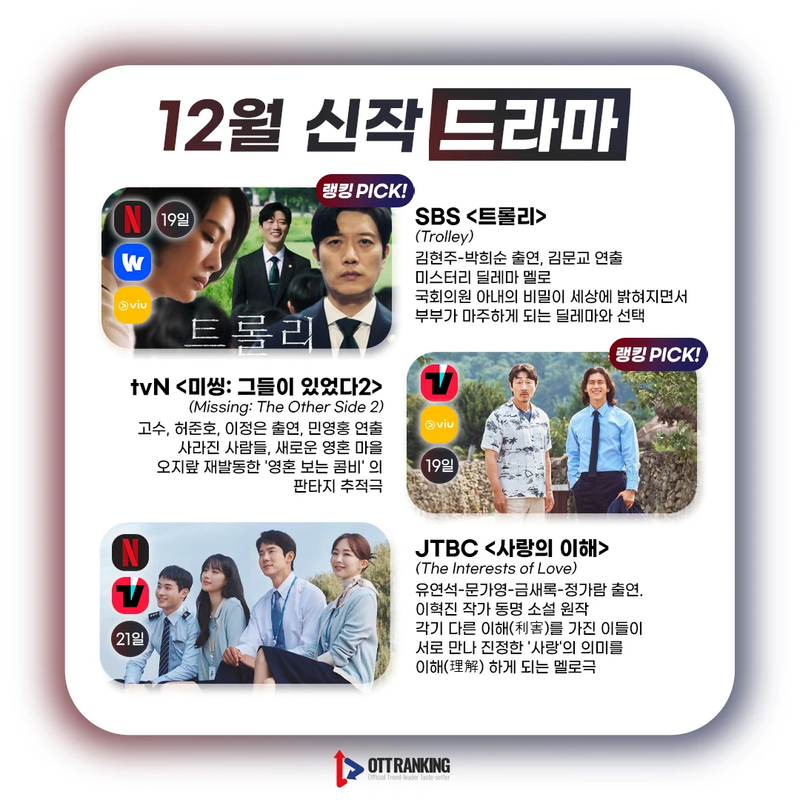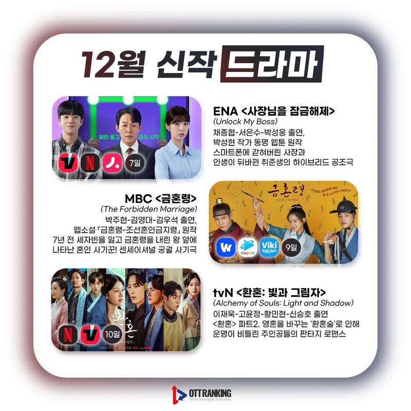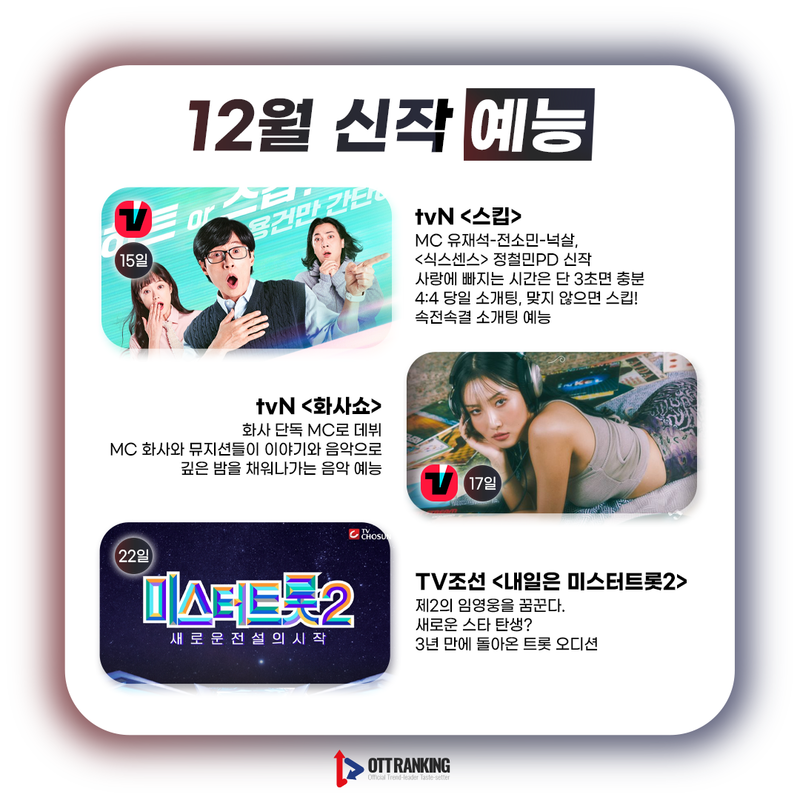 [매거진] 12월 TV 드라마-예능 주요 신작, 어떤 OTT에서 볼까? 입력 2022-12-05 13:40 수정 2025-04-09 18:26 12월 주요 시작 TV 드라마-예능 편 카드뉴스 어떤 OTT에서 볼 수 있을까? Previous [리액션] "왓챠답다"는 칭찬일까, 아쉬움일까…‘오늘은 좀 � Next LG유플러스, 400억에 왓챠 대주주로 나선다 관련기사 Romance in 21st Century Grand Prince’s Wife Sparks BuzzElena NovakDrama Review 2025-11-13 19:26 [OTT 한줄평] 영화 '3일의 휴가'Jane RimOTT Online Line Review 2024-03-15 15:41 [OTT 한줄평] 영화 '비밀'Jane RimOTT Online Line Review 2024-03-15 15:40 [OTT 한줄평] 영화 '뜨거운 피'Jane RimOTT Online Line Review 2024-03-15 15:38 [첫방D-DAY] “지금까지 이런 코미디는 없었다”, 이병헌 감독✕류승룡✕안재홍의 ‘닭강정’ (넷플)Jane RimContents 2024-03-15 15:30 [위클리 OTT 랭킹] 3월 2주차 디즈니·쿠팡·왓챠·애플 TOP3 – 스릴과 코믹 사이Jane RimWeekly Top3 2024-03-15 13:49 [데일리 OTT 랭킹] 3/15 웨이브·티빙·넷플 TOP10 – ‘나는 SOLO’ 과몰입의 날안현정Daily Top10 2024-03-15 10:34 [오늘의 OTT 통합 랭킹] 3월 15일 – 설레거나 스릴 있거나Jane RimOTT All Rankings 2024-03-15 10:31 [OTT 영화 랭킹] 3/14 넷플·티빙·웨이브 – 동화 같은 이야기Jane RimMovie Ranking 2024-03-14 15:18 Romance in 21st Century Grand Prince’s Wife Sparks Buzz [OTT 한줄평] 영화 '3일의 휴가' [OTT 한줄평] 영화 '비밀' [OTT 한줄평] 영화 '뜨거운 피' [첫방D-DAY] “지금까지 이런 코미디는 없었다”, 이병헌 감독✕류승룡✕안재홍의 ‘닭강정’ (넷플) [위클리 OTT 랭킹] 3월 2주차 디즈니·쿠팡·왓챠·애플 TOP3 – 스릴과 코믹 사이 [데일리 OTT 랭킹] 3/15 웨이브·티빙·넷플 TOP10 – ‘나는 SOLO’ 과몰입의 날 [오늘의 OTT 통합 랭킹] 3월 15일 – 설레거나 스릴 있거나 [OTT 영화 랭킹] 3/14 넷플·티빙·웨이브 – 동화 같은 이야기 [데일리 OTT 랭킹] 3/14 넷플·티빙·웨이브 TOP10 – 사탕보다 달콤한 [오늘의 OTT 통합 랭킹] 3월 14일 – ‘눈물의 여왕’, 흥행의 제왕! [매거진] 풋풋한 사랑으로 가득 채운 화이트데이 OTT 추천작