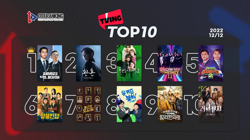 티빙(TVING) 1위 역시 tvN 금토일극 <재벌집 막내아들>이 차지했다. 파격적인 주 3회 편성, 회귀를 소재로 한 판타지 요소로 화제가 된 이 드라마는 11일 방송(11회)에서 전국 유료방송가입가구 기준 시청률 21.13%를 기록하며 자체 최고 시청률 기록을 갈아치웠다. 올해 방송된 주중미니시리즈 가운데 20% 넘는 시청률을 기록한 드라마는 <재벌집 막내아들>이 유일하다. 남은 이야기가 길지 않은 만큼 지금의 기세를 충분히 이어갈 수 있을 것이라는 분석이다.