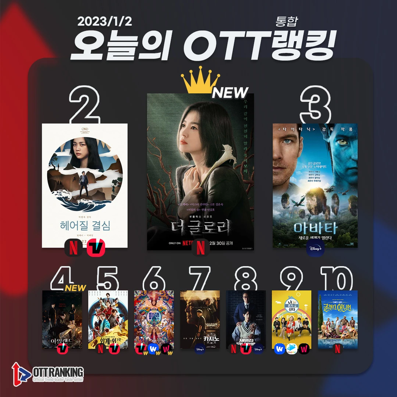 1월 2일 [오늘의 OTT 통합 랭킹] TOP3는 △더 글로리(The Glory) △헤어질 결심(Decision to Leave) △아바타(Avatar)다. 이어 △아일랜드(Island) △외계+인 1부(Alienoid) △에브리씽 에브리웨어 올 앳 원스(Everything Everywhere All at Once) △카지노(Big Bet) △재벌집 막내아들(Reborn Rich) △나 혼자 산다(Home Alone) △나이브스 아웃: 글래스 어니언(Glass Onion: A Knives Out Mystery) 순으로 차트인했다.