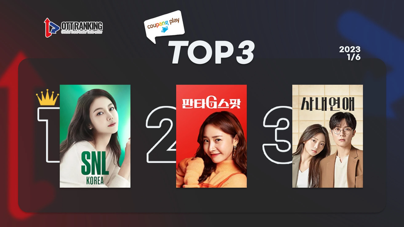 쿠팡플레이(Coupang Play) 1위는 <SNL 코리아 Saturday Night Live Korea3>, 2위는 오리지널 드라마 <판타G스팟>, 3위는 오리지널 예능 <사내연애>다.