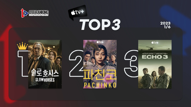 애플TV+(AppleTV Plus)에서는 스릴러 드라마 <슬로 호시스 SLOW HORESE>가 1위다. <파친코 Pachinko>는 2위로 밀려났고, 3위는 에코3<ECHO3>다.