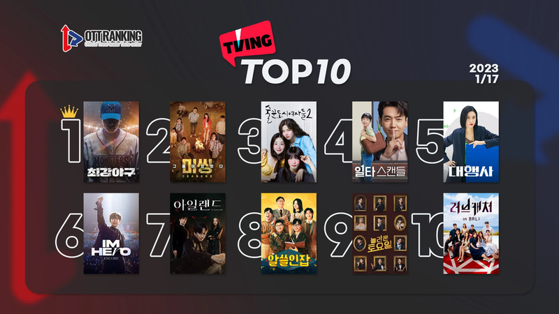 티빙(TVING) 1위는 JTBC <최강야구>다. 프로야구팀에 대적할 만한 11번째 구단 ‘최강 몬스터즈’가 전국의 야구 강팀과 펼치는 양보 없는 대결을 그린 <최강야구>는 '김성근 매직'이 프로그램 안팎으로 통한 모양새다. 최근 김성근 감독과 이대호의 합류에 힘입어 2회 연속 콜드 게임 승을 달성한 것. 회를 거듭할수록 일취월장하는 모습과 함께 실력으로 실력으로 '최강'을 증명해 나가는 몬스터즈의 활약에 많은 야구팬이 야구 비시즌의 아쉬움을 달래고 있다.