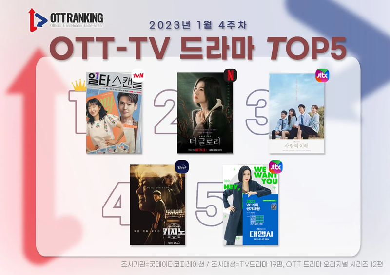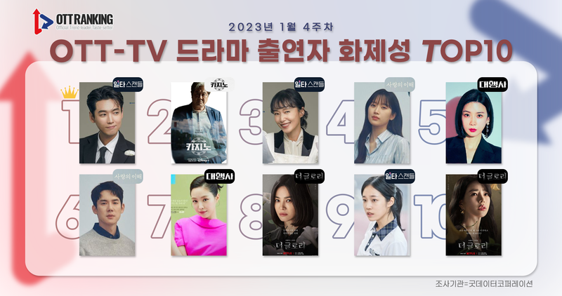 OTT-TV 통합 드라마 부문 및 OTT-TV 통합 드라마 출연자 부문 화제성 순위는 굿데이터코퍼레이션이 1월 23일부터 29일까지 방송 중이거나 예정인 TV드라마 19편, OTT 드라마 오리지널 시리즈 12편 등 총 31편과 작품들에 출연한 출연자들을 대상으로 뉴스 기사, VON(블로그/커뮤니티), 동영상, SNS에서 발생한 프로그램 관련 정보들과 이에 대한 네티즌 반응을 분석한 결과다.