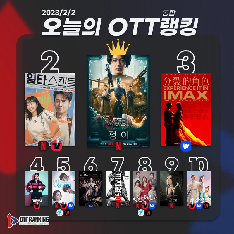 2월 2일 [오늘의 OTT 통합 랭킹] TOP3는 △정이(JUNG_E) △일타 스캔들(Crash Course in Romance) △에브리씽 에브리웨어 올 앳 원스(Everything Everywhere All at Once)다. 이어 △대행사(Agency) △상견니(Someday or One Day) △더 메뉴(The Menu) △피지컬: 100(Physical: 100) △빨간 풍선(Red Balloon) △더 글로리(The Glory) △경경일상(New Life Begins) 순으로 차트인했다.