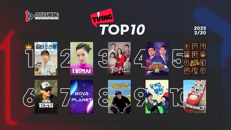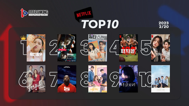 tvN 토일극 <일타 스캔들>은 3위를 기록했으며, 최종화 공개를 앞둔 오리지널 예능 <피지컬: 100>은 4위를 지켰다. 오리지널 드라마 <연애대전>은 5위를 기록하며 숨 고르기 중이며, 조던 필 감독의 영화 <놉>은 넷플릭스 스트리밍을 시작하며 7위로 차트인했다. 3월 10일 파트2 공개를 앞둔 <더 글로리>는 9위로 꾸준히 사랑받고 있다.