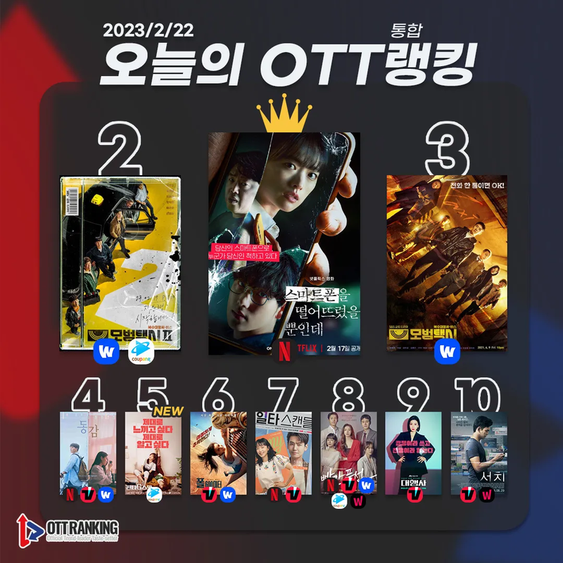 2월 22일 [오늘의 OTT 통합 랭킹] TOP3는 △스마트폰을 떨어뜨렸을 뿐인데(Unlocked) △모범택시2(Taxi Driver2) △모범택시(Taxi Driver)다. 이어 △동감(Ditto) △판타G스팟(Hit the Spot) △폴: 600미터(Fall) △일타 스캔들(Crash Course in Romance) △빨간 풍선(Red Balloon) △대행사(Agency) △서치(Searching) △놉(Nope) 순으로 차트인했다.