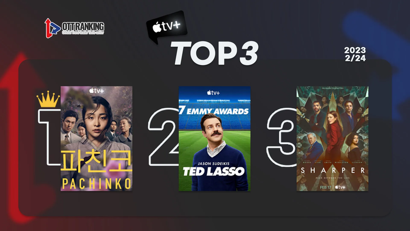 2위는 스포츠 코미디 드라마 <테드 래소 TED LASSO>다. 오는 3월 시즌3 공개 일정이 전해지며 앞선 이야기를 정주행하는 이들이 늘며 드라마의 인기를 견인하고 있다. 3위는 누아르 스릴러 영화 <샤퍼 SHARPER>가 차지했다.