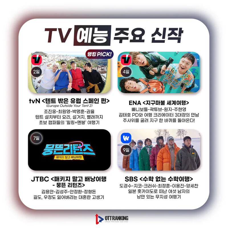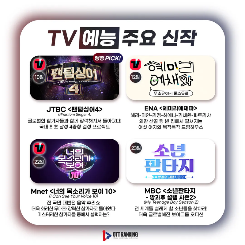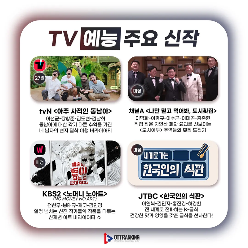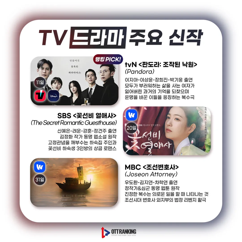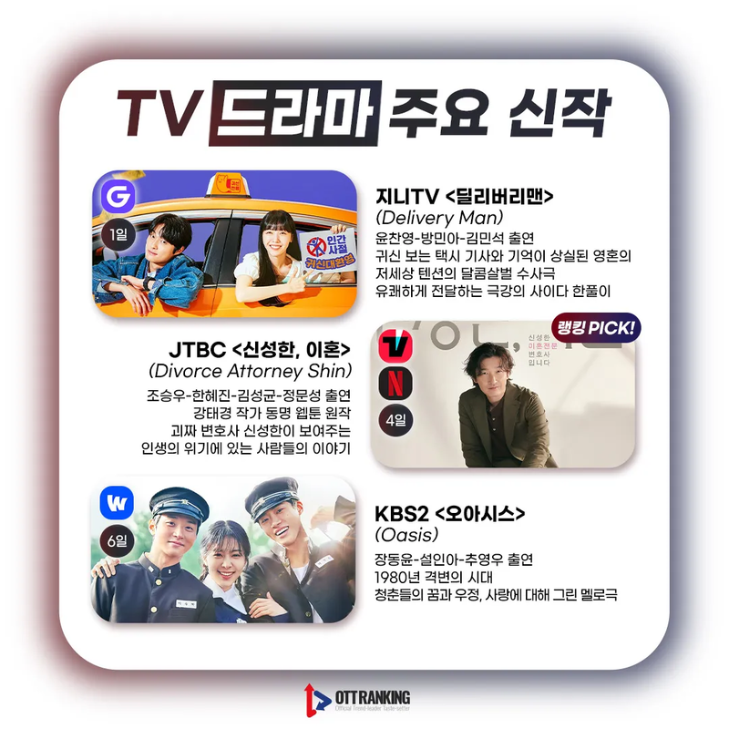 [매거진] 3월 TV 주요 신작, 새로운 얼굴부터 반가운 얼굴까지 입력 2023-02-28 16:00 수정 2025-04-09 18:40 3월 TV 드라마-예능 주요 신작 드라마는 시대극부터 현대극까지 다양 예능엔 새로운 얼굴多, 색다른 케미 기대 Previous [매거진] 3월 OTT 주요 신작, 퀄리티 높은 콘텐츠 Next 봉준호 감독 "OTT 영화 극장 선공개, 좀 더 유연해졌으면" 外 관련기사 Romance in 21st Century Grand Prince’s Wife Sparks BuzzElena NovakDrama Review 2025-11-13 19:26 [OTT 한줄평] 영화 '3일의 휴가'Jane RimOTT Online Line Review 2024-03-15 15:41 [OTT 한줄평] 영화 '비밀'Jane RimOTT Online Line Review 2024-03-15 15:40 [OTT 한줄평] 영화 '뜨거운 피'Jane RimOTT Online Line Review 2024-03-15 15:38 [첫방D-DAY] “지금까지 이런 코미디는 없었다”, 이병헌 감독✕류승룡✕안재홍의 ‘닭강정’ (넷플)Jane RimContents 2024-03-15 15:30 [위클리 OTT 랭킹] 3월 2주차 디즈니·쿠팡·왓챠·애플 TOP3 – 스릴과 코믹 사이Jane RimWeekly Top3 2024-03-15 13:49 [데일리 OTT 랭킹] 3/15 웨이브·티빙·넷플 TOP10 – ‘나는 SOLO’ 과몰입의 날안현정Daily Top10 2024-03-15 10:34 [오늘의 OTT 통합 랭킹] 3월 15일 – 설레거나 스릴 있거나Jane RimOTT All Rankings 2024-03-15 10:31 [OTT 영화 랭킹] 3/14 넷플·티빙·웨이브 – 동화 같은 이야기Jane RimMovie Ranking 2024-03-14 15:18 Romance in 21st Century Grand Prince’s Wife Sparks Buzz [OTT 한줄평] 영화 '3일의 휴가' [OTT 한줄평] 영화 '비밀' [OTT 한줄평] 영화 '뜨거운 피' [첫방D-DAY] “지금까지 이런 코미디는 없었다”, 이병헌 감독✕류승룡✕안재홍의 ‘닭강정’ (넷플) [위클리 OTT 랭킹] 3월 2주차 디즈니·쿠팡·왓챠·애플 TOP3 – 스릴과 코믹 사이 [데일리 OTT 랭킹] 3/15 웨이브·티빙·넷플 TOP10 – ‘나는 SOLO’ 과몰입의 날 [오늘의 OTT 통합 랭킹] 3월 15일 – 설레거나 스릴 있거나 [OTT 영화 랭킹] 3/14 넷플·티빙·웨이브 – 동화 같은 이야기 [데일리 OTT 랭킹] 3/14 넷플·티빙·웨이브 TOP10 – 사탕보다 달콤한 [오늘의 OTT 통합 랭킹] 3월 14일 – ‘눈물의 여왕’, 흥행의 제왕! [매거진] 풋풋한 사랑으로 가득 채운 화이트데이 OTT 추천작
