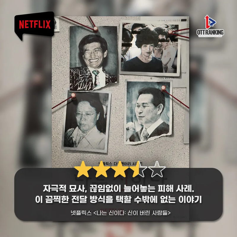 [OTT 한줄평] 넷플릭스 다큐 ‘나는 신이다: 신이 버린 사람들’ Picture Member for 1 year 1 month Real name 안현정 Position 연구원 Bio 정보 범람의 시대를 함께 헤쳐 나갈 동반자로서 꼭 필요한 정보, 거짓 없는 정보만을 전하기 위해 노력하겠습니다. 오늘을 사는 모든 분을 응원합니다. 입력 2023-03-10 16:04 수정 2025-04-09 18:44 넷플릭스 <나는 신이다: 신이 버린 사람들> ★★★☆ 자극적 묘사, 끊임없이 늘어놓는 피해 사례. 이 끔찍한 전달 방식을 택할 수밖에 없는 이야기 Picture Member for 1 year 1 month Real name 안현정 Position 연구원 Bio 정보 범람의 시대를 함께 헤쳐 나갈 동반자로서 꼭 필요한 정보, 거짓 없는 정보만을 전하기 위해 노력하겠습니다. 오늘을 사는 모든 분을 응원합니다. Previous [OTT 한줄평] 웨이브 다큐 ‘국가수사본부’ Next [첫방D-DAY] 송혜교 “모든 복선 다 터질 것” 넷플릭스 ‘더 � 관련기사 Romance in 21st Century Grand Prince’s Wife Sparks BuzzElena NovakDrama Review 2025-11-13 19:26 [OTT 한줄평] 영화 '3일의 휴가'Jane RimOTT Online Line Review 2024-03-15 15:41 [OTT 한줄평] 영화 '비밀'Jane RimOTT Online Line Review 2024-03-15 15:40 [OTT 한줄평] 영화 '뜨거운 피'Jane RimOTT Online Line Review 2024-03-15 15:38 [첫방D-DAY] “지금까지 이런 코미디는 없었다”, 이병헌 감독✕류승룡✕안재홍의 ‘닭강정’ (넷플)Jane RimContents 2024-03-15 15:30 [위클리 OTT 랭킹] 3월 2주차 디즈니·쿠팡·왓챠·애플 TOP3 – 스릴과 코믹 사이Jane RimWeekly Top3 2024-03-15 13:49 [데일리 OTT 랭킹] 3/15 웨이브·티빙·넷플 TOP10 – ‘나는 SOLO’ 과몰입의 날안현정Daily Top10 2024-03-15 10:34 [오늘의 OTT 통합 랭킹] 3월 15일 – 설레거나 스릴 있거나Jane RimOTT All Rankings 2024-03-15 10:31 [OTT 영화 랭킹] 3/14 넷플·티빙·웨이브 – 동화 같은 이야기Jane RimMovie Ranking 2024-03-14 15:18 Romance in 21st Century Grand Prince’s Wife Sparks Buzz [OTT 한줄평] 영화 '3일의 휴가' [OTT 한줄평] 영화 '비밀' [OTT 한줄평] 영화 '뜨거운 피' [첫방D-DAY] “지금까지 이런 코미디는 없었다”, 이병헌 감독✕류승룡✕안재홍의 ‘닭강정’ (넷플) [위클리 OTT 랭킹] 3월 2주차 디즈니·쿠팡·왓챠·애플 TOP3 – 스릴과 코믹 사이 [데일리 OTT 랭킹] 3/15 웨이브·티빙·넷플 TOP10 – ‘나는 SOLO’ 과몰입의 날 [오늘의 OTT 통합 랭킹] 3월 15일 – 설레거나 스릴 있거나 [OTT 영화 랭킹] 3/14 넷플·티빙·웨이브 – 동화 같은 이야기 [데일리 OTT 랭킹] 3/14 넷플·티빙·웨이브 TOP10 – 사탕보다 달콤한 [오늘의 OTT 통합 랭킹] 3월 14일 – ‘눈물의 여왕’, 흥행의 제왕! [매거진] 풋풋한 사랑으로 가득 채운 화이트데이 OTT 추천작