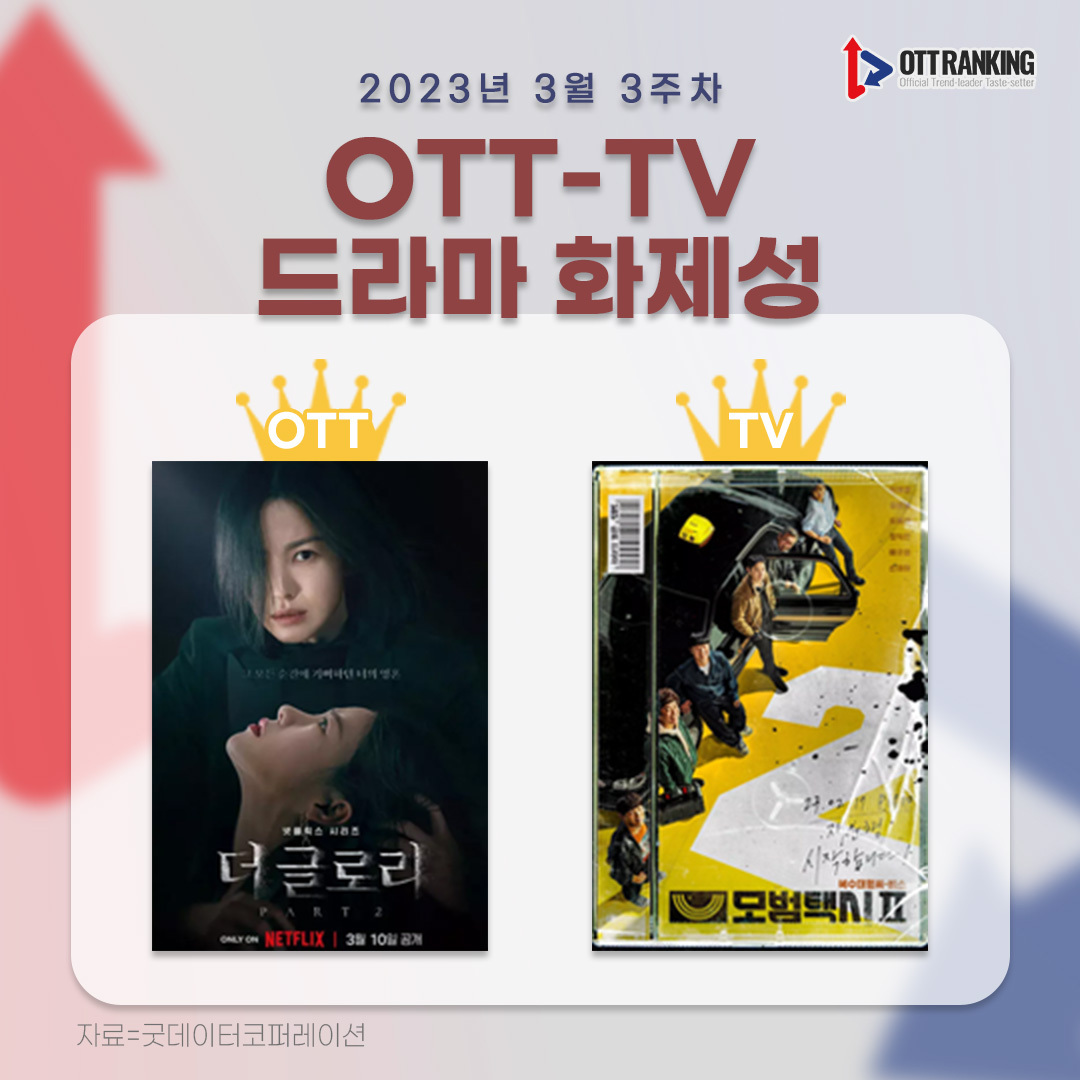 넷플릭스 오리지널 시리즈 <더 글로리>와 SBS 금토극 <모범택시2>가 3월 3주 차 OTT-TV 드라마 부문 화제성 최상위를 장식하며 복수극 열풍을 이어가고 있다.