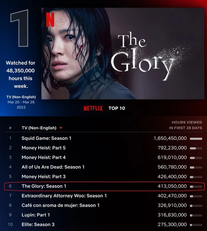 공개 당시부터 OTT랭킹을 휩쓴 <더 글로리>는 총 4억 1,305만의 누적 시청 시간을 기록하며 넷플릭스 TV(비영어) 부문 역대 시청 시간 6위로 올라섰다. 국내 작품으로는 <오징어 게임>, <지금 우리 학교는>을 잇는 성과다. 파트1은 5주 동안 TOP 10 리스트에 진입, 파트2는 29일 기준 공개 직후 3주 연속 비영어 부문 1위 자리를 수성하고 있다.
