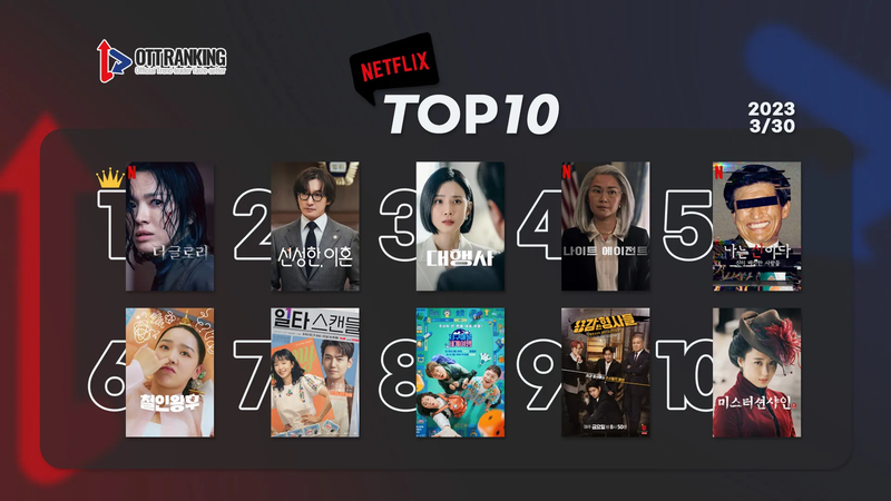 넷플릭스(Netflix)에서는 <더 글로리>가 다시 1위를 차지했다. 누적 시청시간 4억 시간 이상으로 글로벌 역대 흥행 6위를 기록한 만큼 쉽게 왕좌를 내어주지 않을 전망이다. JTBC 토일극 <신성한, 이혼>은 한 단계 물러난 2위다. 피아니스트 출신 이혼 전문 변호사로 분한 조승우(신성한 역)의 활약으로 6%대 시청률을 유지하고 있다.