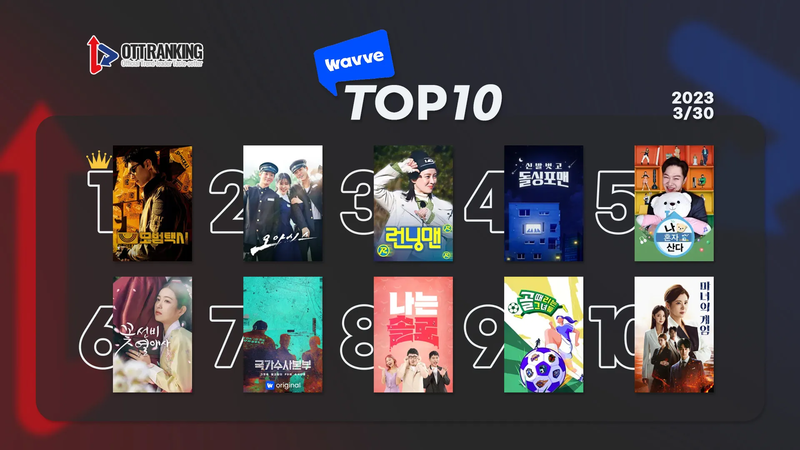 웨이브(Wavve) 차트에는 큰 변화가 없다. SBS 금토극 <모범택시2>가 부동의 1위를 지켰다. KBS2 월화극 <오아시스>가 2위로 올라섰고, SBS 주말 대표 예능 <런닝맨>이 3위로 한 단계 밀려났다. MBC <나 혼자 산다>는 5위로 중위권을 유지했고, SBS 월화극 <꽃선비 열애사>가 6위로 상승세를 보였다. 순위 변동 속에서도 오리지널 <국가수사본부>는 7위를 유지했다. 평일 인기 예능 <나는 솔로>와 <골 때리는 그녀들>이 각각 8위와 9위에 이름을 올렸다. 장서희 주연의 MBC 일일드라마 <마녀의 게임>이 10위다.