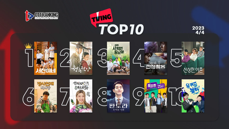 4위에는 지난 3월 31일 공개한 티빙 오리지널 <방과 후 전쟁활동>이 오르며 존재감을 드러냈고, 5위에는 JTBC <신성한, 이혼>이 자리했다. 백종원의 해외 식당 창업기를 담은 tvN의 새 예능 <장사천재 백사장>이 6위, MZ 대표 여자 연예인들의 복작복작 살림살이를 담은 ENA <혜미리예채파>가 7위를 기록했다. 이어 다소 아쉬운 성적을 보이는 tvN 토일극 <판도라: 조작된 낙원이> 8위를 차지했고, 9위와 10위에는 각각 JTBC <톡파원 25시>, tvN <유 퀴즈 온 더 블록>이 올랐다.