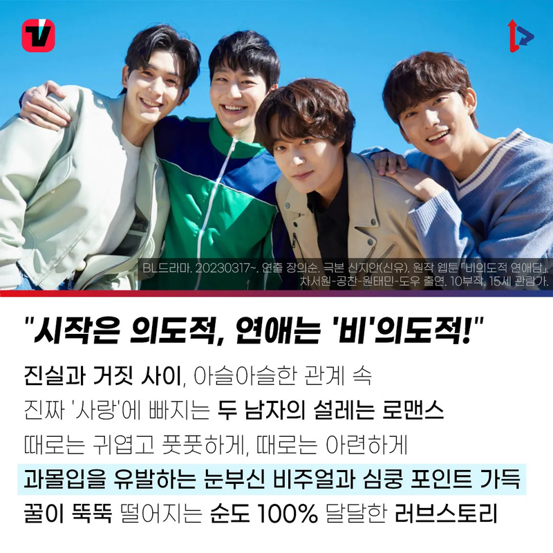 [왓츠인마이OTT] 과몰입 주의! 순도 100% 로맨스, ‘비의도적 연애담’ Picture Member for 1 year 1 month Real name Sellin Kim Bio 좋은 콘텐츠는 언제나 일상 속 소통과 휴식의 일부분이 됩니다. 누구나 편안하고 즐길 수 있는 콘텐츠로 일상 속 소소한 즐거움을 선사하겠습니다. 입력 2023-04-06 17:50 수정 2025-04-09 18:45 티빙에서 만나는 BL 드라마 '비의도적 연애담' 눈부신 비주얼과 심쿵 포인트 가득 꿀 떨어지는 두 남자의 설레는 로맨스 Picture Member for 1 year 1 month Real name Sellin Kim Bio 좋은 콘텐츠는 언제나 일상 속 소통과 휴식의 일부분이 됩니다. 누구나 편안하고 즐길 수 있는 콘텐츠로 일상 속 소소한 즐거움을 선사하겠습니다. Previous [오늘의 OTT 통합 랭킹] 4월 7일 – '존 윅' 차트 장악, 전도연 � Next ‘칸의 여왕’ 전도연의 한계 없는 행보 [인터뷰] 관련기사 Romance in 21st Century Grand Prince’s Wife Sparks BuzzElena NovakDrama Review 2025-11-13 19:26 [OTT 한줄평] 영화 '3일의 휴가'Jane RimOTT Online Line Review 2024-03-15 15:41 [OTT 한줄평] 영화 '비밀'Jane RimOTT Online Line Review 2024-03-15 15:40 [OTT 한줄평] 영화 '뜨거운 피'Jane RimOTT Online Line Review 2024-03-15 15:38 [첫방D-DAY] “지금까지 이런 코미디는 없었다”, 이병헌 감독✕류승룡✕안재홍의 ‘닭강정’ (넷플)Jane RimContents 2024-03-15 15:30 [위클리 OTT 랭킹] 3월 2주차 디즈니·쿠팡·왓챠·애플 TOP3 – 스릴과 코믹 사이Jane RimWeekly Top3 2024-03-15 13:49 [데일리 OTT 랭킹] 3/15 웨이브·티빙·넷플 TOP10 – ‘나는 SOLO’ 과몰입의 날안현정Daily Top10 2024-03-15 10:34 [오늘의 OTT 통합 랭킹] 3월 15일 – 설레거나 스릴 있거나Jane RimOTT All Rankings 2024-03-15 10:31 [OTT 영화 랭킹] 3/14 넷플·티빙·웨이브 – 동화 같은 이야기Jane RimMovie Ranking 2024-03-14 15:18 Romance in 21st Century Grand Prince’s Wife Sparks Buzz [OTT 한줄평] 영화 '3일의 휴가' [OTT 한줄평] 영화 '비밀' [OTT 한줄평] 영화 '뜨거운 피' [첫방D-DAY] “지금까지 이런 코미디는 없었다”, 이병헌 감독✕류승룡✕안재홍의 ‘닭강정’ (넷플) [위클리 OTT 랭킹] 3월 2주차 디즈니·쿠팡·왓챠·애플 TOP3 – 스릴과 코믹 사이 [데일리 OTT 랭킹] 3/15 웨이브·티빙·넷플 TOP10 – ‘나는 SOLO’ 과몰입의 날 [오늘의 OTT 통합 랭킹] 3월 15일 – 설레거나 스릴 있거나 [OTT 영화 랭킹] 3/14 넷플·티빙·웨이브 – 동화 같은 이야기 [데일리 OTT 랭킹] 3/14 넷플·티빙·웨이브 TOP10 – 사탕보다 달콤한 [오늘의 OTT 통합 랭킹] 3월 14일 – ‘눈물의 여왕’, 흥행의 제왕! [매거진] 풋풋한 사랑으로 가득 채운 화이트데이 OTT 추천작