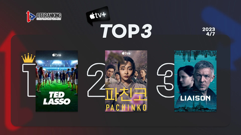 애플TV+(AppleTV Plus) 1위는 <테드 래소 TED LASSO>다. 축구에 대해 아무것도 모르는 미국 미식축구 코치 테드 래소(제이슨 서디키스 분)이 영국 프리미어 리그 축구팀 코치로 발탁되면서 벌어지는 이야기를 그린 스포츠 코미디 드라마다. 2021년과 2022년 에미상을 석권하며 애플TV의 대표 콘텐츠로 자리 잡았다. 지난 15일 시즌3가 공개된 후 한국 시청자들에게도 큰 사랑을 받으며 왕좌를 유지하고 있다.