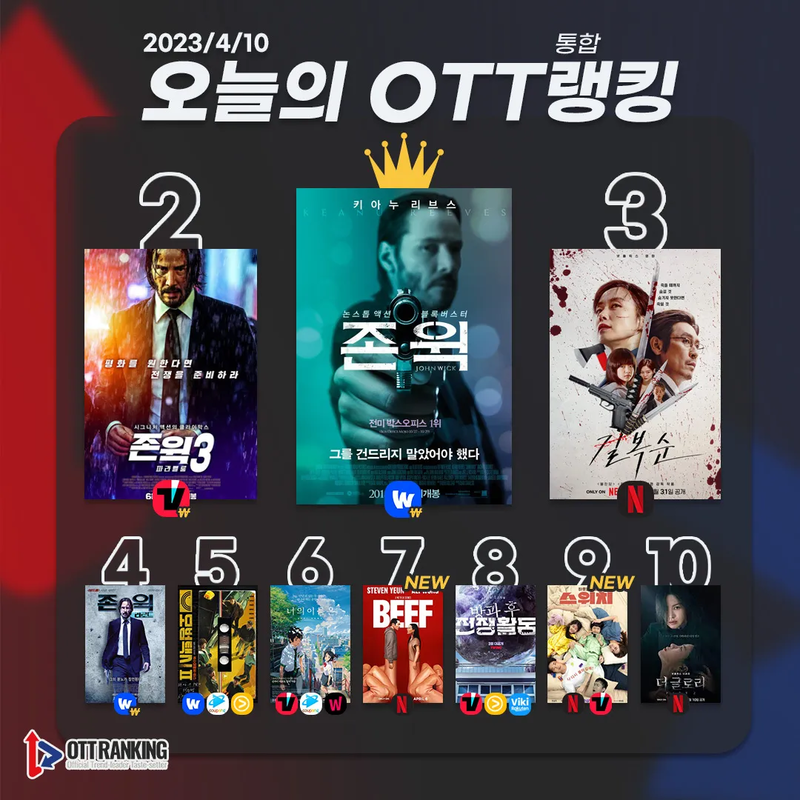 4월 10일 [오늘의 OTT 통합 랭킹] TOP3는 △존 윅(John Wick) △존 윅3: 파라벨룸(John Wick: Chapter3-Parabellum) △길복순(Kill BokSoon)이다. 이어 △존 윅: 리로드(John Wick: Chapter2) △모범택시2(Taxi Driver2) △너의 이름은.(your name.) △성난 사람들(Beef) △방과 후 전쟁활동(Duty After School) △스위치(Switch) △더 글로리(The Glory pt.2) 순으로 차트인했다.