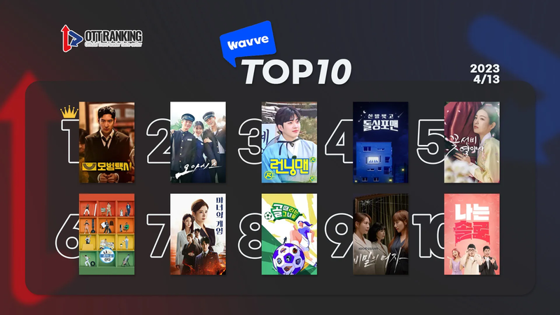 웨이브(Wavve) 1위는 SBS 금토극 <모범택시2>다. 베일에 가려진 택시회사 무지개 운수와 택시기사 김도기(이제훈 분)의 사적 복수 대행극으로 시즌2 시작과 함께 차트 왕좌를 굳건히 지키고 있다. 오는 14일과 15일 마지막 에피소드가 방송된다. 특히 최종화인 16화에서는 배우 김소연이 특별 출연해 강렬한 카리스마로 시청자들을 사로잡을 예정이다. 2023년 상반기 최고의 화제작 중 하나로 떠오른 작품이 써 내려갈 마지막 이야기에 관심이 집중된다.