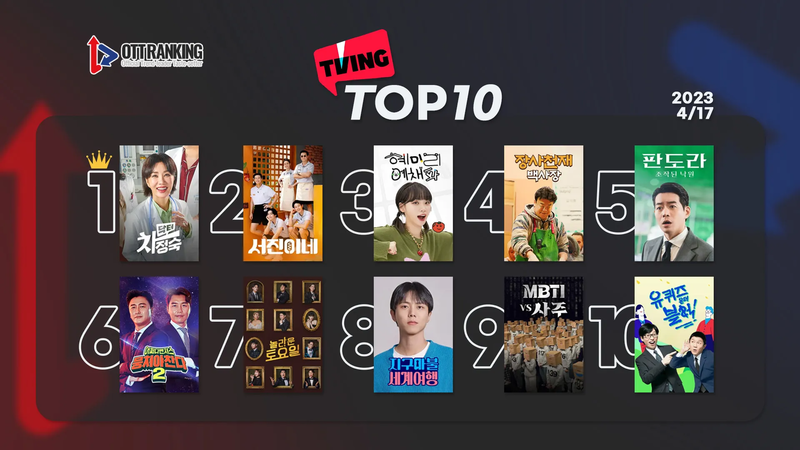 2위는 종영 이후 꾸준히 인기를 이어가고 있는 JTBC <신성한, 이혼>이다. 이혼 전문 변호사 신성한(조승우 분)의 파란만장한 이야기를 공감 있게 그려내며 많은 사랑을 받았던 이 작품은 OTT 차트 내에서도 여전히 식지 않는 인기를 보여주고 있다. 3위는 글로벌 흥행을 기록한 넷플릭스 오리지널 드라마 <더 글로리>가 차지했다.