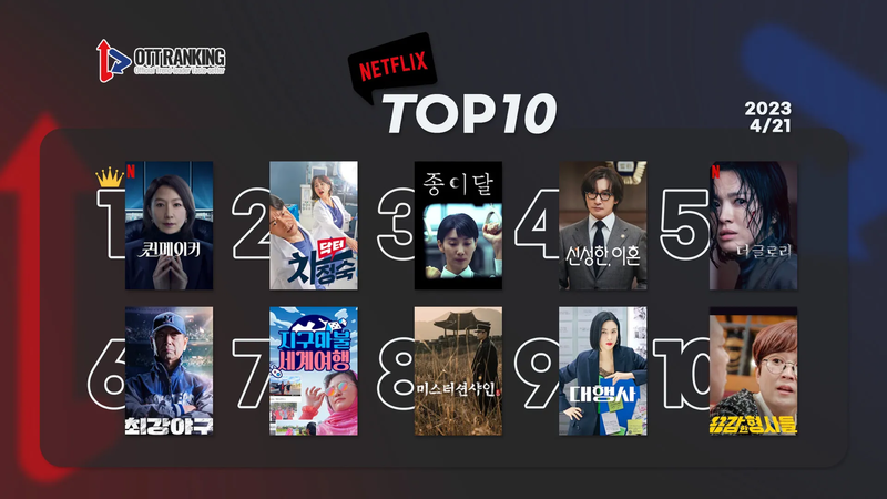 넷플릭스(Netflix) 1위는 오리지널 드라마 <퀸메이커>다. 지난 14일 공개 이후 K-콘텐츠의 저력을 입증하며 순항 중이다. 남성들의 출연이 주류를 이뤘던 기존 정치 드라마와는 다르게 배우 김희애와 문소리를 앞세운 여성 서사로 신선함을 더한 것이 국내뿐만 아니라 해외 시청자들에게도 주효한 것으로 분석된다. <오징어 게임>, <더 글로리>를 잇는 새로운 K-콘텐츠의 탄생을 알리며 인기에 박차를 가하고 있는 만큼 한동안 차트 내 상위권을 물들일 전망이다.