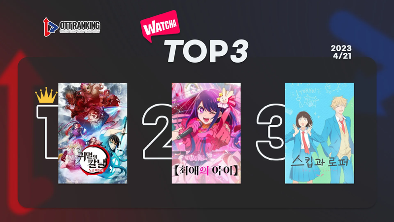 2위는 <【최애의 아이】 Oshi no Ko>다. 지난 12일 방영을 시작한 작품으로, TV 방송 이후 왓챠를 비롯한 다양한 OTT 플랫폼에서 스트리밍 서비스를 제공하고 있지만 마니아층이 잘 형성되어 있는 왓챠에서 크게 사랑받고 있다. 동명의 일본 만화를 원작으로 한다. 3위에는 지난 4일 방영을 시작한 일본 애니메이션 <스킵과 로퍼 Skip and Loafer>가 올랐다.