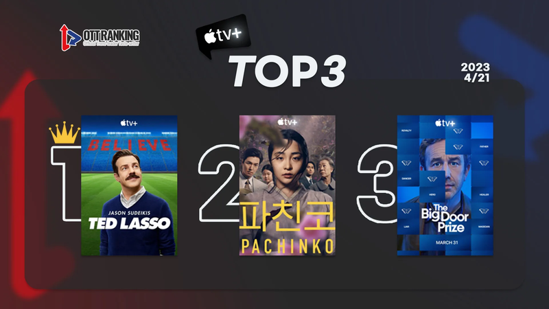 애플TV+(AppleTV Plus) 1위는 스포츠 코미디 드라마 <테드 래소 TED LASSO>다. 축구에 대해 아는 것이 없는 미식 축구 코치가 영국 축구팀 코치로 발탁되면서 일어나는 이야기를 그린 작품으로 지난 3월 15일 시즌3 공개를 시작했다. 작품은 2021년과 2022년 2년 연속 에미상 최다 수상작, 골든글로브 시상식 뮤지컬 코미디 부문 남우주연상 수상 등 기록을 세우며 전 세계인들의 사랑을 받는 시리즈로 자리매김했다.