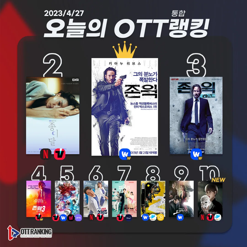 4월 27일 [오늘의 OTT 통합 랭킹] TOP3는 △존 윅(John Wick) △종이달(Pale Moon) △존 윅: 리로드(John Wick: Chapter2)이다. 이어 △존 윅3: 파라벨룸(John Wick: Chapter3-Parabellum) △귀멸의 칼날: 도공 마을편(Demon Slayer: Kimetsu no Yaiba Swordsmith Village Arc) △닥터 차정숙(Doctor Cha) △패밀리(Family: The Unbreakable Bond) △모범택시2(Taxi Driver2) △오아시스(Oasis) △가면의 여왕(Queen Of Mask) 순으로 차트인했다.