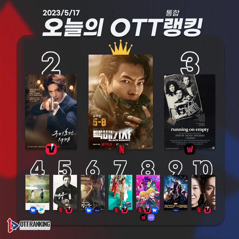 5월 17일 [오늘의 OTT 통합 랭킹] TOP3는 △택배기사(Black Knight) △구미호뎐1938(Tale of the Nine Tailed 1938) △허공에의 질주(Running On Empty)다. 이어 △어쩌다 마주친, 그대(Run Into You) △영웅(Hero) △낭만닥터 김사부 시즌3(Romantic Dr. Kim3) △닥터 차정숙(Doctor Cha) △최애의 아이(Oshio no ko) △가디언즈 오브 갤럭시(Guardians of the Galaxy) △나쁜엄마(The Good Bad Mother) 순으로 차트인했다.