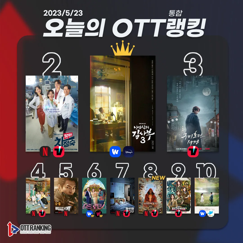 5월 23일 [오늘의 OTT 통합 랭킹] TOP3는 △낭만닥터 김사부 시즌3(Romantic Dr. Kim3) △닥터 차정숙(Doctor Cha) △구미호뎐1938(Tale of the Nine Tailed 1938)이다. 이어 △나쁜엄마(The Good Bad Mother) △택배기사(Black Knight) △킬링 로맨스(Killing Romance) △마루이 비디오(Marui Video) △3000년의 기다림(Three Thousand Years of Longing) △뿅뿅 지구오락실2(Earth Arcade2) △어쩌다 마주친, 그대(Run Into You) 순으로 차트인했다.