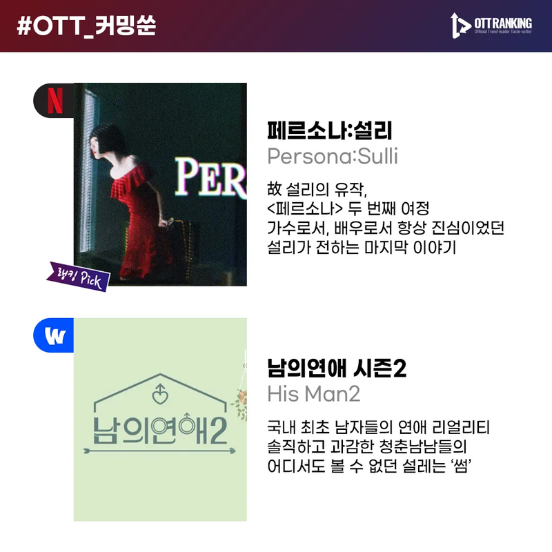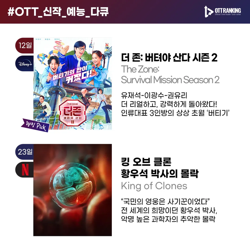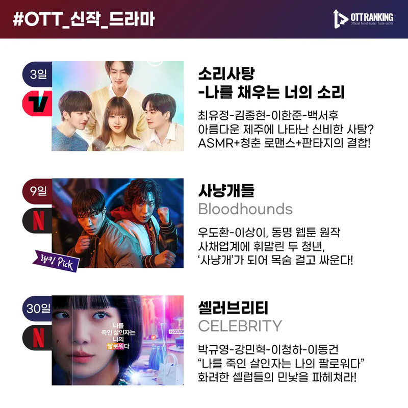 [매거진] 6월 OTT 주요 신작, 풍성하고 색다른 장르 Picture Member for 1 year 1 month Real name Sellin Kim Bio 좋은 콘텐츠는 언제나 일상 속 소통과 휴식의 일부분이 됩니다. 누구나 편안하고 즐길 수 있는 콘텐츠로 일상 속 소소한 즐거움을 선사하겠습니다. 입력 2023-06-01 18:41 수정 2025-04-09 18:38 6월 OTT 오리지널 신작 판타지 로맨스-스릴러까지 다채롭다 높은 화제성 자랑하는 작품 多 Picture Member for 1 year 1 month Real name Sellin Kim Bio 좋은 콘텐츠는 언제나 일상 속 소통과 휴식의 일부분이 됩니다. 누구나 편안하고 즐길 수 있는 콘텐츠로 일상 속 소소한 즐거움을 선사하겠습니다. Previous [매거진] 6월 TV 신작, 골라보는 재미 가득! Next [신작 영화] 기대작 가득한 6월 개봉작, 극장 활기 되찾을까 관련기사 Romance in 21st Century Grand Prince’s Wife Sparks BuzzElena NovakDrama Review 2025-11-13 19:26 [OTT 한줄평] 영화 '3일의 휴가'Jane RimOTT Online Line Review 2024-03-15 15:41 [OTT 한줄평] 영화 '비밀'Jane RimOTT Online Line Review 2024-03-15 15:40 [OTT 한줄평] 영화 '뜨거운 피'Jane RimOTT Online Line Review 2024-03-15 15:38 [첫방D-DAY] “지금까지 이런 코미디는 없었다”, 이병헌 감독✕류승룡✕안재홍의 ‘닭강정’ (넷플)Jane RimContents 2024-03-15 15:30 [위클리 OTT 랭킹] 3월 2주차 디즈니·쿠팡·왓챠·애플 TOP3 – 스릴과 코믹 사이Jane RimWeekly Top3 2024-03-15 13:49 [데일리 OTT 랭킹] 3/15 웨이브·티빙·넷플 TOP10 – ‘나는 SOLO’ 과몰입의 날안현정Daily Top10 2024-03-15 10:34 [오늘의 OTT 통합 랭킹] 3월 15일 – 설레거나 스릴 있거나Jane RimOTT All Rankings 2024-03-15 10:31 [OTT 영화 랭킹] 3/14 넷플·티빙·웨이브 – 동화 같은 이야기Jane RimMovie Ranking 2024-03-14 15:18 Romance in 21st Century Grand Prince’s Wife Sparks Buzz [OTT 한줄평] 영화 '3일의 휴가' [OTT 한줄평] 영화 '비밀' [OTT 한줄평] 영화 '뜨거운 피' [첫방D-DAY] “지금까지 이런 코미디는 없었다”, 이병헌 감독✕류승룡✕안재홍의 ‘닭강정’ (넷플) [위클리 OTT 랭킹] 3월 2주차 디즈니·쿠팡·왓챠·애플 TOP3 – 스릴과 코믹 사이 [데일리 OTT 랭킹] 3/15 웨이브·티빙·넷플 TOP10 – ‘나는 SOLO’ 과몰입의 날 [오늘의 OTT 통합 랭킹] 3월 15일 – 설레거나 스릴 있거나 [OTT 영화 랭킹] 3/14 넷플·티빙·웨이브 – 동화 같은 이야기 [데일리 OTT 랭킹] 3/14 넷플·티빙·웨이브 TOP10 – 사탕보다 달콤한 [오늘의 OTT 통합 랭킹] 3월 14일 – ‘눈물의 여왕’, 흥행의 제왕! [매거진] 풋풋한 사랑으로 가득 채운 화이트데이 OTT 추천작
